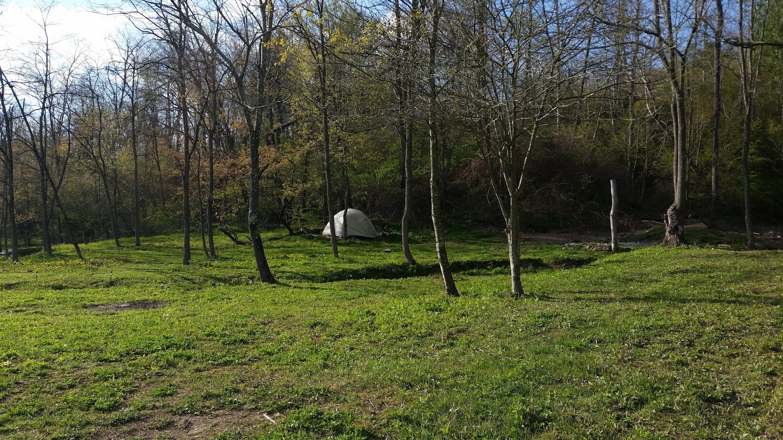 Through the yet to bloom Locust tree barrier, the crowd of tents stood
